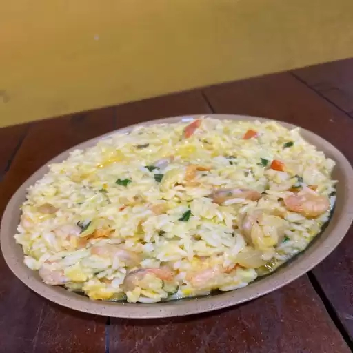 Camarão, arroz, queijo, creme de leite e tempero tradicional.